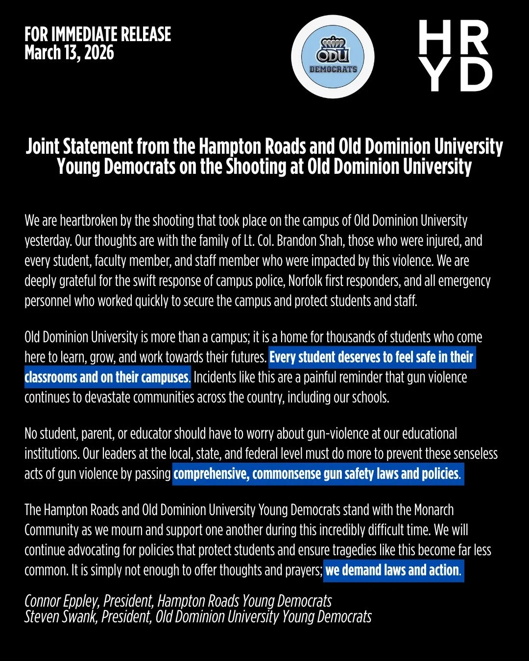 Weβre a chartered chapter of Virginia Young Dems where Young Democrats ages 13 - 35 in Hampton Roads come together to support Democratic candidates, advocate for progressive change, and make a better Hampton Roads. Our reach spans across Chesapeake, Hampton, Isle of Wight, James City, Newport News, Norfolk, Portsmouth, Suffolk, Virginia Beach, and Williamsburg.
